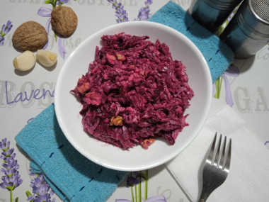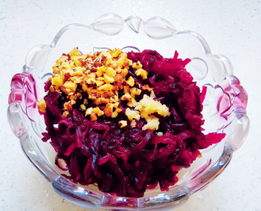 Сделала салат свекла с чесноком и грецким орехом по этому рецепту. Отварила свеклу до готовности и остудила. Почистила грецкие орехи и чеснок. Натерла на тёрке с крупными отверстиями очищенную отварную свеклу. Измельчила орехи, но не очень мелко, чтоб были средние кусочки. Чеснок выдавила через пресс. Всё соединила и заправила майонезом 67%. Отменный вышел салат. Он очень вкусный и полезный. Чеснока я положила побольше, люблю чеснок) Салат из свеклы сладковатый и островатый одновременно. Я очень люблю этот салатик. Он вкусный и аппетитный. Подавала с пюрешкой из картошки и котлетками. Невероятно вкусно. Орешки в этом салате отлично смакуют. Замечательный рецепт! Благодарю автора!
