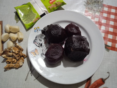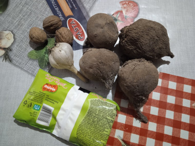 Как сделать салат из свеклы с чесноком и грецким орехом? Подготовьте продукты. Свеклу постарайтесь выбрать сладких сортов, она обычно темного цвета. Корнеплоды должны быть твердые, без вмятин и признаков порчи. Грецкие орехи можете взять уже очищенные или очистить их сами.