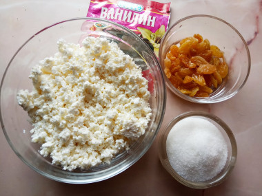 Подготовьте продукты для начинки. Творог можете взять любой жирности, главное, чтобы он не был слишком рассыпчатым. Сахар вы можете заменить сахарозаменителем, который не боится термической обработки. Например, сукралозой.