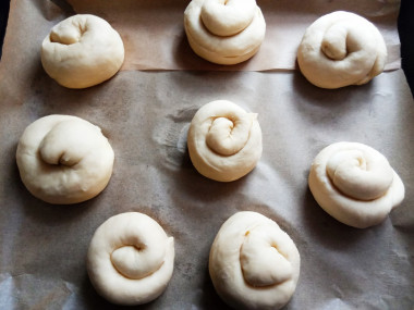 Выложите булочки с творогом на застеленный пергаментом противень и оставьте примерно на 25-30 минут для расстойки.