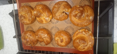 Выпекайте булочки из дрожжевого теста около 25 минут при 180°С. Точное время и температуру запекания определяйте по своей духовке.