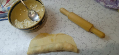 Как красиво завернуть булочки? Каждый кусочек теста раскатайте в прямоугольник. Раскатывайте не очень тонко, чтобы тесто при выпекании не порвалось и начинка не вытекла. Выложите творожную начинку вдоль длинного края теста и сверните тесто рулетиком.