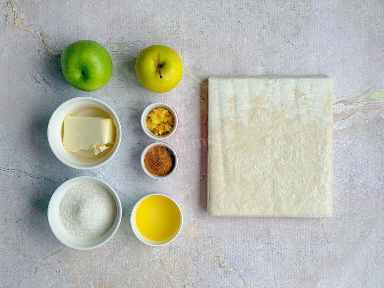 Подготовьте ингредиенты. Слоеное тесто заранее разморозьте в закрытой упаковке (чтобы не заветрилось) в течение 2-3 часов при комнатной температуре, либо достаньте с вечера и положите в холодильник на ночь. Я выпекала булочки из слоеного дрожжевого теста с яблоками, но можно взять и бездрожжевое.