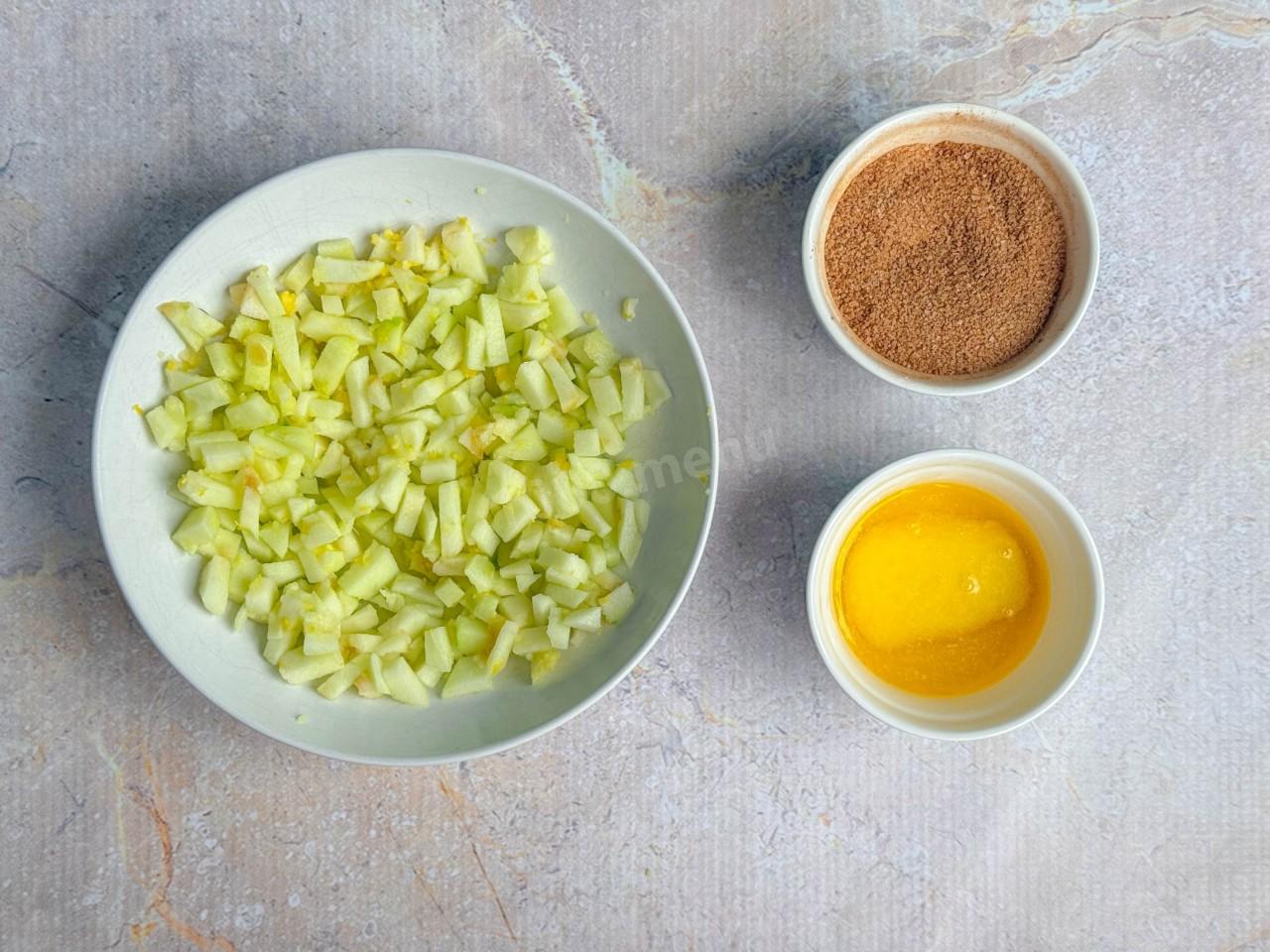 Яблоки промойте и очистите от шкурки. Вырежьте сердцевину, удалите все семечки и нарежьте фрукты мелкими кубиками. Переложить их в небольшую емкость. Чтобы яблоки не потемнели, сразу полейте их лимонным соком. Добавьте цедру и перемешайте. При желании можете дополнить начинку изюмом.