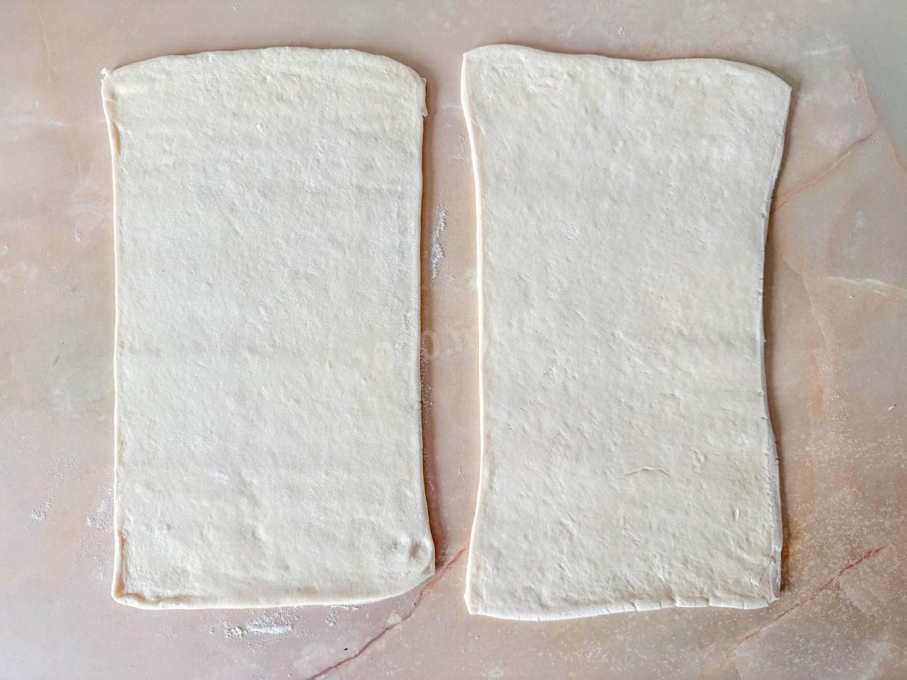 Размороженное слоеное тесто разверните и раскатайте в тонкий лист. Если тесто липнет к поверхности и скалке, то добавьте немного муки. Лист теста разделите на две равные части. Если слоеное тесто уже запаковано листами, то в этом случае, раскатайте два листа до одинакового размера.