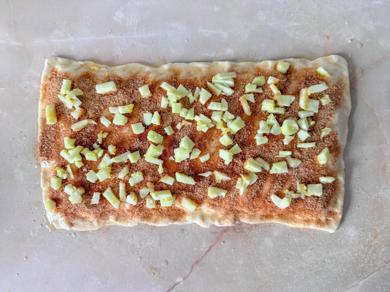 Постелите один лист теста на рабочую поверхность. При помощи кулинарной кисти смажьте поверхность теста растопленным сливочным маслом(1/2 от общего объема) и посыпьте смесью из сахара и корицы(1/2 от общего объема). Сверху выложите измельченные яблоки(весь объем) и распределите ровным слоем по всей площади листа. Сверху яблоки накройте вторым листом теста. Снова смажьте маслом, посыпьте сахаром и корицей.