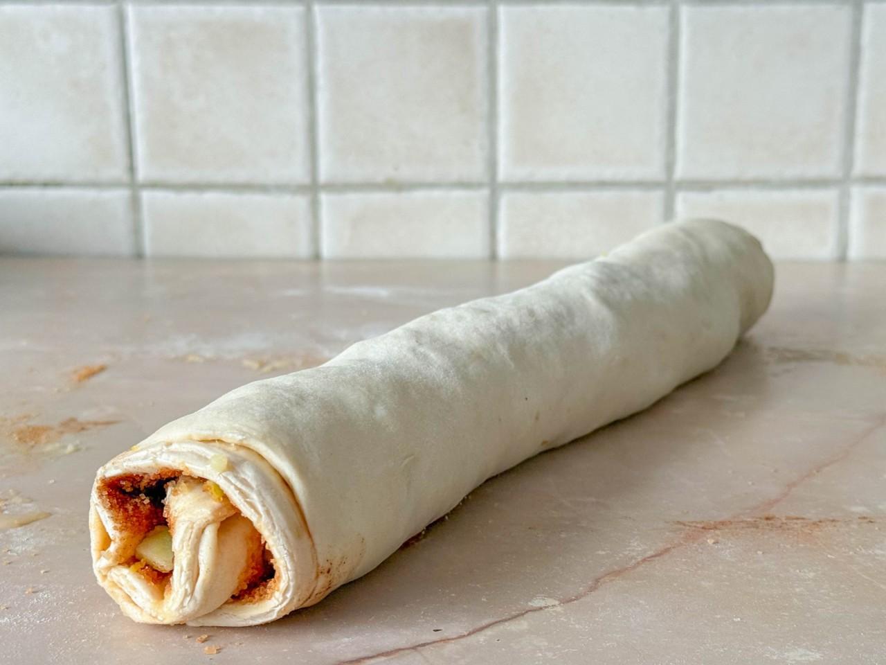 Шаг 6. Как правильно свернуть тесто с начинкой в рулет и нарезать его на булочки??