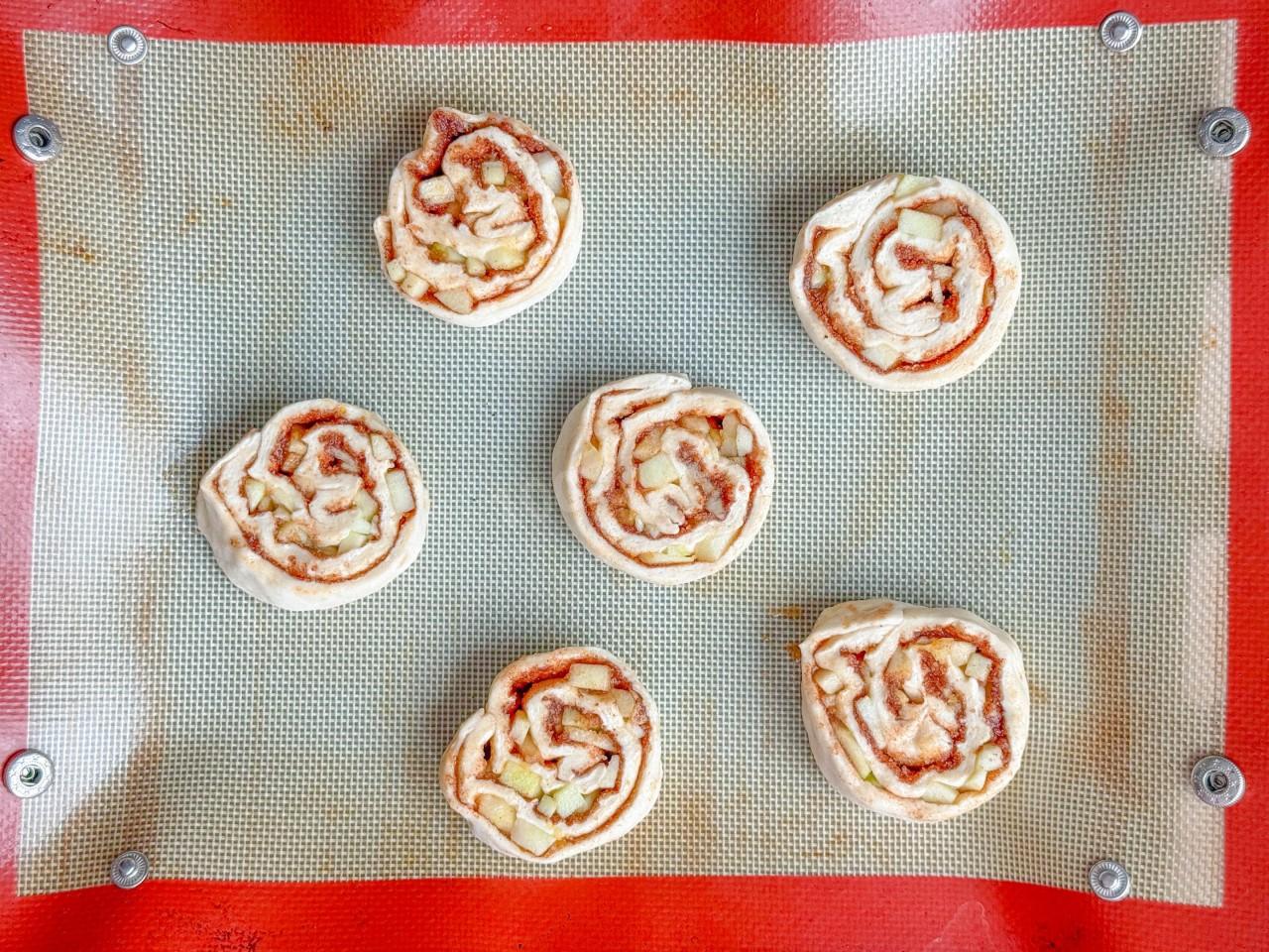 Взявшись за край, сверните тесто вместе с начинкой в рулет. Острым ножом нарежьте рулет на равные кусочки шириной примерно 3 см. Перенесите кусочки на противень, застеленный пергаментом или силиконовым ковриком. Мне потребовалось 2 противня.