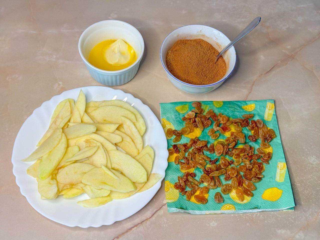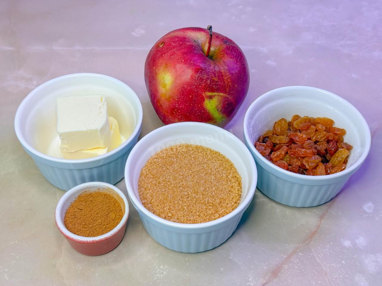 Яблоко помойте, очистите от кожуры и порежьте на тонкие, практически полупрозрачны дольки. Можно использовать специальную широкую насадку у терки. Я нарезала при помощи острого ножа. Изюм промойте и залейте кипятком, чтобы он стал мягче. Затем слейте воду и просушите изюм. Смешайте коричневый сахар и корицу. Растопите сливочное масло до мягкой консистенции. По своему вкусу дополните начинку специями(мускатный орех, ванилин), цедрой цитрусовых.