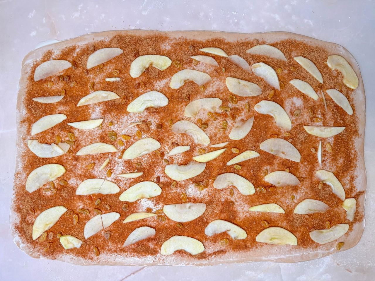 Сначала распределите растопленное масло по поверхности теста при помощи лопатки, кисти или рук. Посыпьте смесью сахара и корицы. Далее равномерно разложите изюм и яблоки.