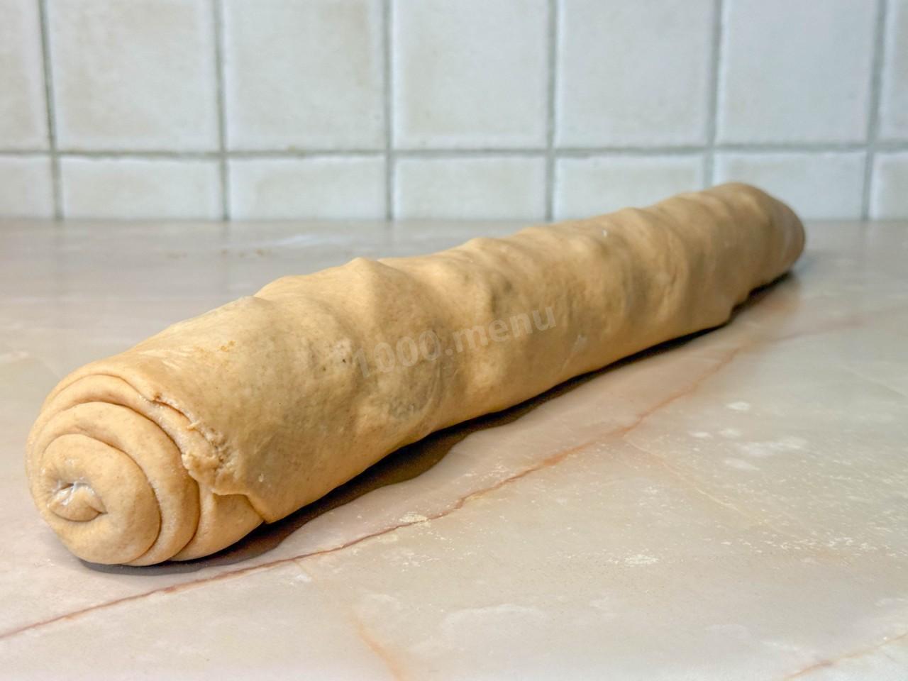 Начиная с одного края (более узкого), скатайте тесто вместе с начинкой в плотный рулет. Положите рулет швом вниз.