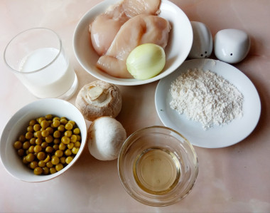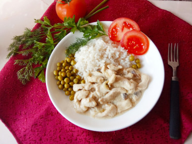 Кроме указанных автором продуктов решила добавить немного шампиньонов и зелёный горошек. Шампиньоны добавила после обжарки лука, но в следующий раз , если буду добавлять грибы- то одновременно с луком, чтобы лук не успел сильно зарумяниться после добавления и обжаривания кусочков курицы в муке. Сливки брала 10%. Зелёный горошек в этот раз тушить в соусе не стала-добавила при подаче в качестве гарнира. При тушении сливочный соус очень быстро загустел, пришлось добавить немного бульона, чтобы блюдо не подогрело. Такого белоснежного и густого фрикасе, как у Анны у меня в результате не получилось, но вкус-отменный! Спасибо!