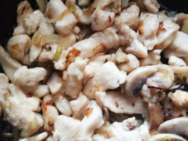 Добавьте к луку в сковороду куриное филе в муке. Обжарьте мясо, постоянно помешивая, несколько минут, чтобы каждый кусочек слегка подрумянился.
