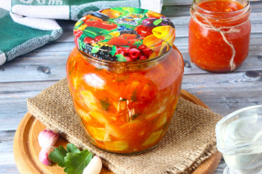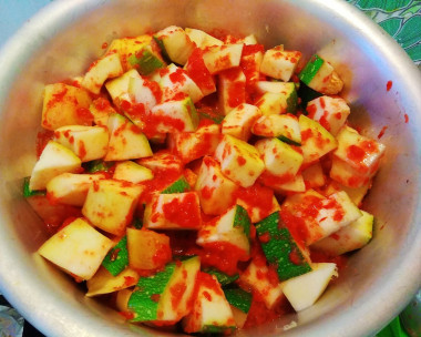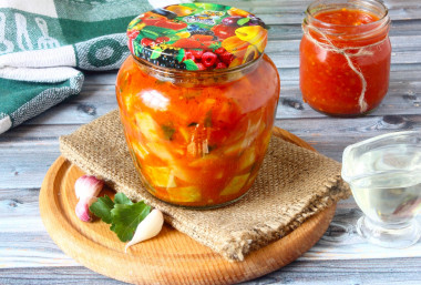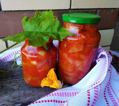 У меня выросло два огромных кабачка (или цукини, не знаю даже, они зеленые и полосатые). Очень люблю различные кабачковые заготовки, поэтому приготовила эту замечательную закуску. Один кабачок почистила, т.к. шкурка у него загрубела, а второй, поменьше, не чистила. Нарезала крупными кусками. Всего получилось 2,5 кг. Соответственно увеличила количество других ингредиентов. Томатная заливка делается очень просто и быстро, просто пропустила помидоры через мясорубку. Варила чуть дольше, ведь и овощей получился целый тазик) Закатала все так, как и указано в рецепте. Готовая закуска мне очень понравилась! Осталось немного на пробу, но даже сфотографировать не успела, так вкусно было) Кабачки не разварились, остались целыми и немного похрустывают, приятная консистенция. На вкус просто потрясающе, теперь этот рецепт обязательно внесу в мою записную книжечку, будет рядом с бабушкиными рецептами) Спасибо, очень вкусно!