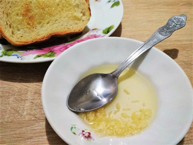 Выложите измельченный чеснок в тарелочку, добавьте чайную ложку оливкового масла. Перемешайте, поставьте на 15-30 секунд в микроволновку при средней мощности.