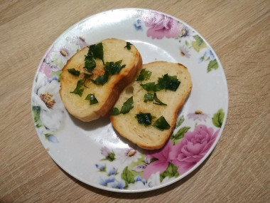 Выньте тарелочку с чесноком, перемешайте чесночную массу и намажьте ею поверхность обжаренных кусочков хлеба. Каждый кусочек сразу, пока гренки горячие, посыпаем мелко порубленным свежими укропом. Благодаря добавлению укропа и чеснока гренки получаются очень вкусными и ароматными, от такого соединения получается небольшой привкус грибов. По желанию можно посыпать другой свежей зеленью или смесью.