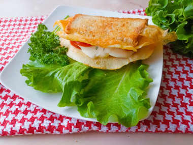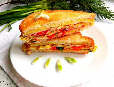 Я в восторге от этого сэндвича с яйцом и сыром на сковороде! Даже и не думала, что можно таким интересным способом его приготовить. Все делала по рецепту, кстати, спасибо за подробную инструкцию. Сам процесс приготовления очень увлекает) В начинку положила пластинки плавленного сыра, помидоры и зеленый лук. Во время сворачивания сэндвича остатки яйца подвернула вовнутрь, получилось аккуратно. А еще мне понравился поджаренный хлеб, видимо тостерный хлеб какой-то особенный, предназначенный именно для поджаривания. Корочка получилась красивая, румяная. Сэндвич замечательный, внутри сочный, мягкий, а снаружи хрустящий! Он очень вкусный! К тому же сытный и питательный. Я делала два, для себя и сына. Сын попросил готовить такую вкусняшку почаще) Спасибо большое за рецепт!