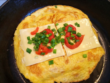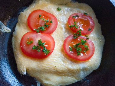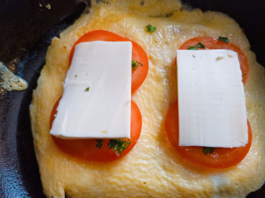 Дождитесь, когда яйцо схватится и подрумянится снизу. Быстрым аккуратным движением переверните блинчик на другую сторону. Он может порваться, не страшно, на вкус это никак не повлияет. Выложите на хлеб кружочки помидора, посыпьте зеленью. На помидор положите кусочки сыра. Накройте сковороду крышкой, убавьте огонь и дождитесь расплавления сыра.