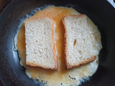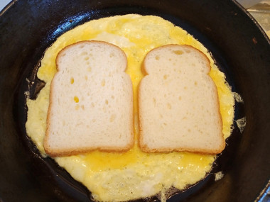 Разогрейте на среднем огне сковороду. Налейте на нее немного растительного масла, прогрейте его. Вылейте на сковороду яйца, а сверху выложите оба кусочка хлеба.