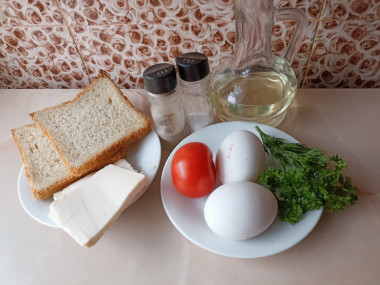 Калорийность продуктов: Белый хлеб, Яйца, Помидоры, Твёрдый сыр, Растительное масло, Зелень, Соль