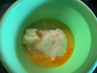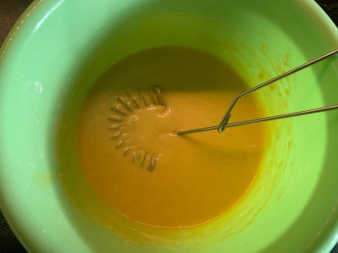 Перемешайте масло с яйцом. Здесь уже лучше перейти на венчик. Или воспользоваться миксером, как вам удобнее. Далее вбейте второе яйцо, снова хорошо перемешайте массу. Так как я готовила половину порции, я уже это не делала.