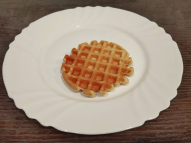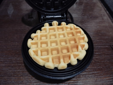 Пеките вафлю до золотистого цвета. Время выпечки будет отличаться для разных приборов — оно зависит от мощности и других особенностей модели вафельницы. Моя печет одну вафлю за 4-5 минут. Готовую вафлю снимите на тарелку. Испеките таким образом вафли из всего теста. У меня из половины порции получилось 6 штук. Горячие вафли мягкие, но после остывания становятся тверже.