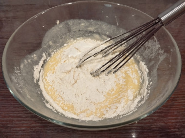 Всыпьте разрыхлитель, перемешайте. Начните по ложке добавлять муку, перемешивая после каждого добавления тесто венчиком. Вам нужно добиться консистенции, напоминающей тесто для оладьев — густое, но при этом пластичное. У меня ушло меньше муки, чем указано в рецепте.