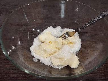 Положите мягкое масло в миску. Если вы не успели его достать заранее, то можете немного подогреть его в микроволновке. Буквально несколько секунд — масло не должно растаять, лишь размягчиться. Всыпьте к маслу сахар и щепотку соли (для баланса вкуса). Хорошо разотрите масло с сахаром до получения однородной массы. Достаточно будет простой вилки.