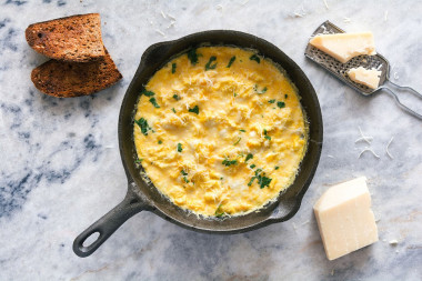 Если сковорода слишком сильно разогрета, омлет быстро схватится снизу, но потеряет влагу и пышность.