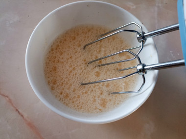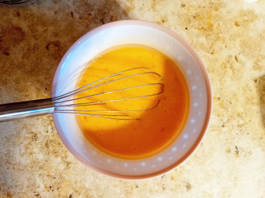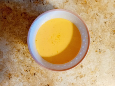 Яйца помойте, обсушите. Обязательно мойте яйца перед использованием, так как даже на кажущейся чистой скорлупе могут находиться вредные бактерии. Яйца разбейте в подходящую по размеру миску. Взбейте венчиком яйца до однородности, чтобы белок соединился с желтком.