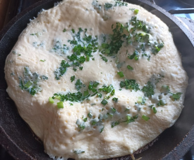 Примерно через 5-6 минут масса загустеет и схватится. Омлет поднимется. Время приготовления будет зависеть от индивидуальных особенностей работы плиты, а также от высоты омлета.