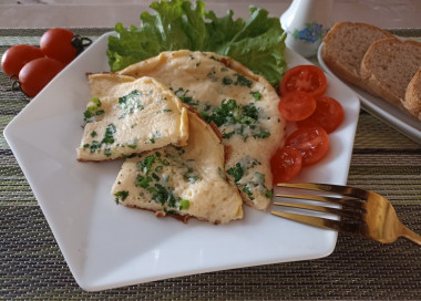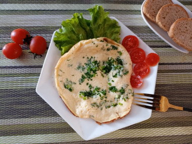 Омлет со сметаной и сыром сразу подавайте к столу, по желанию посыпав свежей зеленью. Приятного аппетита!