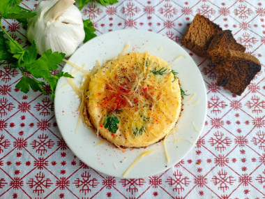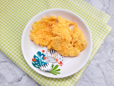 Посыпьте омлет сверху сыром. Прогрейте блюдо на сковороде еще ориентировочно около 1 минуты, чтобы сыр расплавился. Омлет получается немного плотнее, чем на молоке.