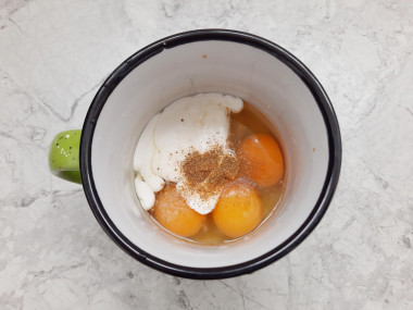 Выложите в миску сметану, посолите, добавьте черный молотый перец, хорошо взбейте. Можете добавить любые специи по вкусу. У меня негустая сметана жирностью 10%. Чем выше жирность сметаны, тем гуще будет омлетная масса.