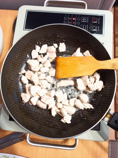 Куриное филе промойте, обсушите и нарежьте брусочками. Какое мясо можно брать помимо курицы? Любое. Подойдет индейка, говядина или свинина. Но при этом учитывайте, что изменится калорийность и время приготовления блюда.