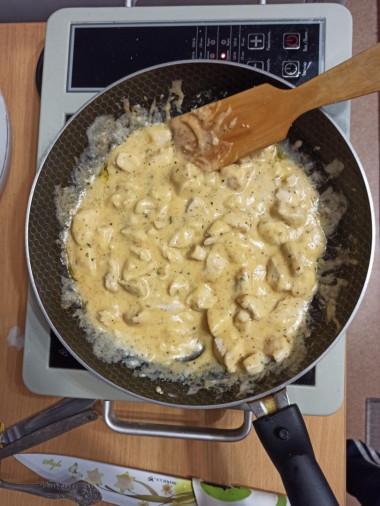 В такое блюдо хорошо добавить шампиньоны. Курица в сметанном соусе да еще и с грибочками - очень вкусно.