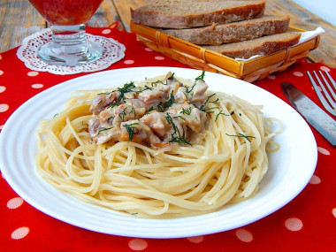 Тушеную курицу в сметане с чесноком разложите по тарелкам и подайте к столу с любым гарниром. Я подавала с макаронами. Приятного аппетита!