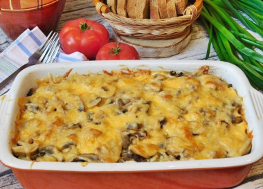 За время запекания сыр расплавится и немного начнет подрумяниваться. Извлеките форму из духовки, разложите по тарелкам и подавайте к столу в горячем виде. Приятного аппетита!