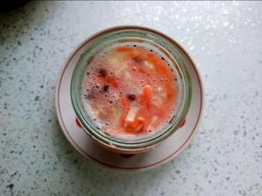 Сверху на капусту нужно поставить гнет, например, кастрюлю меньшего объема с водой, чтобы сок активно выделялся из овощей. Оставляем заготовку при комнатной температуре на двое суток. Кастрюлю лучше поставить в таз, чтобы выделяющийся сок не вытек на пол или стол.