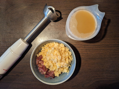 Пожарила отдельно лук. И когда начала пробивать горох блендером, добавила жаренный лук и для консистенции подливала бульон. Посолила и добавила копчёной паприки, что дало очень яркий акцент! Советую использовать эту пряность.