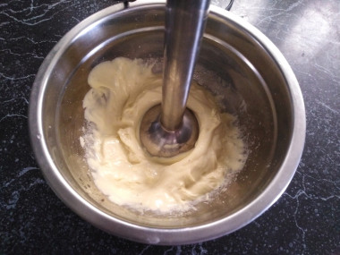 Начните взбивать яичную массу блендером на высоких оборотах, постепенно наливая в нее молочно-масляную смесь. Я взбиваю погружным блендером.