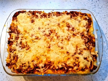 Настоящую лазанью я никогда не делала, т. к. листы для неё трудно найти в наших магазинах. Хорошо, что я нашла на сайте рецепт лазаньи из макарон с фаршем в духовке. Думаю, обычные макароны ничуть не хуже подходят для этого блюда, я взяла "перья". Соусы Бешамель и Болоньезе мне знакомы, у меня вся семья их любит) Сначала я отварила макароны, чтобы они слегка остыли. А затем одновременно готовила соусы. Приготовление фарша в томатном соусе занимает больше времени, но это даже хорошо. Мясо насквозь пропитывается томатом и становится сочным и вкусным. Бешамель я варила на свежем сливочном масле и жирном молоке. Вместо мускатного ореха добавила смесь молотых перцев. После сборки запекала лазанью 35 минут при 200°. до расплавления сыра. Нарезать лазанью из макарон лучше после остывания, так разрез будет чётче, а кусочки целее. Но в горячем виде сразу из духовки вкуснее всего) В этом блюде нейтральные макароны пропитываются аж двумя соусами. Один из них нежный молочный, другой с томатной кислинкой. Для меня это идеальное сочетание! К тому же лазанья по этому рецепту не только вкусная, но и очень сытная. Даже дочка это заметила. Блюдо понравилось всей семье. Ели его на ужин и даже на завтрак) Рецепт рекомендую, очень вкусно!