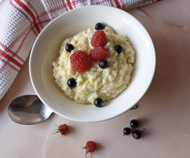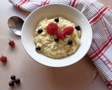 Подавайте кашу к столу, добавив в нее сливочное масло. Можете также по вкусу положить свежие ягоды, варенье или джем. Приятного аппетита!