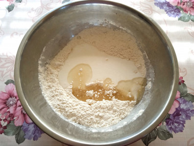 Начните замешивать тесто ложкой, когда оно соберется в комок, переложите его на стол и продолжите замес.