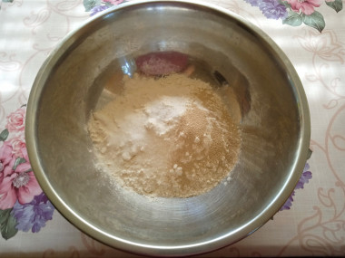Как сделать тесто дрожжевое на кефире как пух? Подготовьте все необходимые ингредиенты. Возьмите глубокую миску, смешайте все сыпучие продукты: просеянную через сито муку, соль, сахар и сухие дрожжи. Все хорошо перемешайте. Вместо сахара можно использовать сахарную пудру. Дрожжи можно взять не сухие, а свежие - в этом случае понадобится 10 грамм и их нужно будет предварительно перемешать с сахаром и теплой водой и оставить на 20-30 минут, до активации.