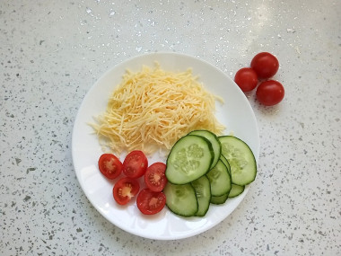Помойте помидоры и нарежьте кружочками. Я брала для рецепта черри, вы можете взять любые по вкусу. Сыр натрите на крупной терке.