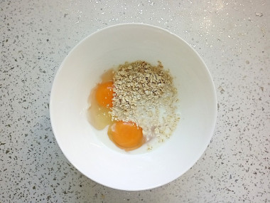 Овсяные хлопья можно предварительно не молоть, а просто замочить в молоке и яйце и оставить для набухания на 5-7 минут. Этот вариант пойдет для тех, кто не любит лишний раз использовать кухонную технику. В миске смешайте половину продуктов для 1 овсяноблина: 1,5 ст.л. крошки, 1 яйцо, 15 мл молока и щепотку соли. Все перемешайте и немного взболтайте, чтобы яйцо хорошо взбилось. Можно приготовить сразу все тесто и при жарке разделить его на две части.