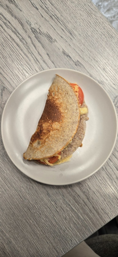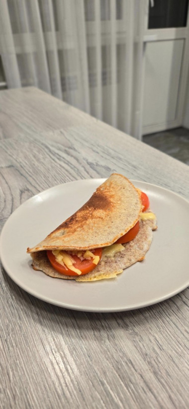 В рецепте количество продуктов дано на два овсяноблина, но я сделала один. Жарила на сковороде диаметром 24 см. Сначала с одной стороны, потом перевернула, поджарила немного и выложила начинку. Для начинки взяла твердый сыр российский, помидорки черри и ломтики огурца. При подаче дополнила простым соусом из сметаны и домашнего кетчупа.