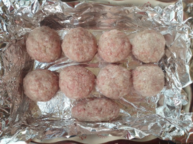 Возьмите подходящую форму для запекания и смажьте ее дно растительным маслом. Я застелила форму фольгой, и смазала уже ее. Так удобнее потом будет мыть форму. Сформируйте из фарша котлеты круглой формы и уложите их в форму.