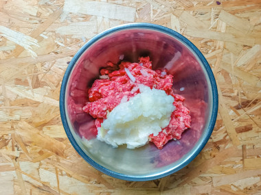 Пока замачивается хлеб, возьмите миску и положите в нее говяжий фарш. Очистите луковицу и натрите ее на средней терке. Добавьте натертый лук в фарш, я терла его сразу в миску.